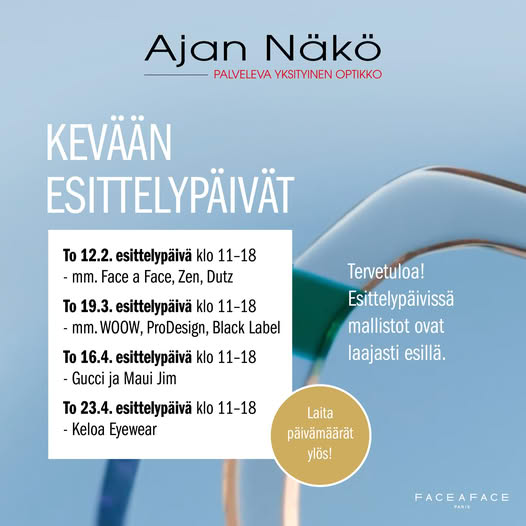Ajan Näössä sinua palvelevat optikot Jaana, Marjo, Juho ja Vesa sekä silmälääkärit Jaana ja Laura. Asiakaspalvelu on intohimomme ja iloitsemme ihanien asiakkaiden löytäessä juuri omanlaisensa silmälasit. Meille on tärkeää, että näet hyvin ja näytät hyvältä.